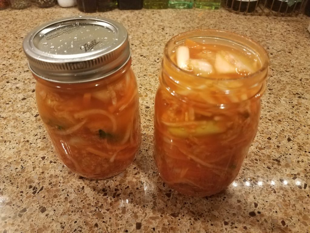 Place the coated cabbage mixture into a 1 quart or two 1 pint mason jars. Add the brine, lightly tapping the jar to settle the cabbage. Add just enough brine to cover the cabbage. Add the lids and seal just past finger tight.